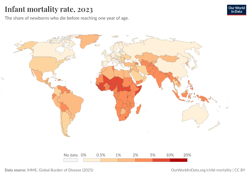 IHME, Global Burden of Disease (2024) – with minor processing by Our World in Data. “Infant mortality rate” [dataset]. IHME, Global Burden of Disease, “Global Burden of Disease - Child Mortality” [original data]. Retrieved February 12, 2026 from https://chart-preview-extension.owid.pages.dev:8789/20250909-093708/grapher/infant-mortality-rate.html (archived on September 9, 2025).