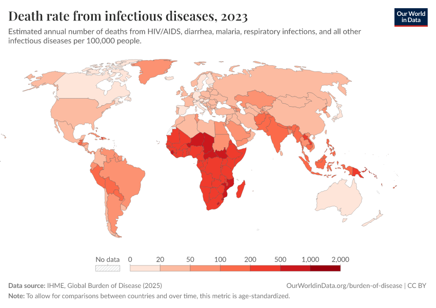 IHME, Global Burden of Disease (2025) – with major processing by Our World in Data. “Death rate from infectious diseases” [dataset]. IHME, Global Burden of Disease, “Global Burden of Disease - Deaths” [original data]. Retrieved February 12, 2026 from https://chart-preview-extension.owid.pages.dev:8789/20260211-174736/grapher/infectious-disease-death-rates.html (archived on February 11, 2026).