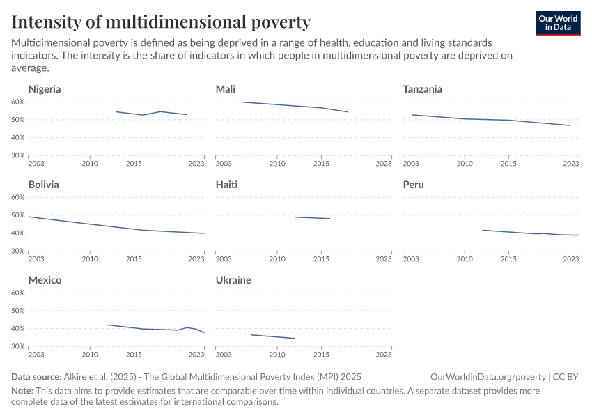 Alkire et al. (2025) - The Global Multidimensional Poverty Index (MPI) 2025 – with minor processing by Our World in Data. “Intensity of multidimensional poverty – Harmonized over time” [dataset]. Alkire et al., “Global Multidimensional Poverty Index (MPI) 2025” [original data]. Retrieved February 12, 2026 from https://chart-preview-extension.owid.pages.dev:8789/20251229-175603/grapher/intensity-of-multidimensional-poverty-hot.html (archived on December 29, 2025).