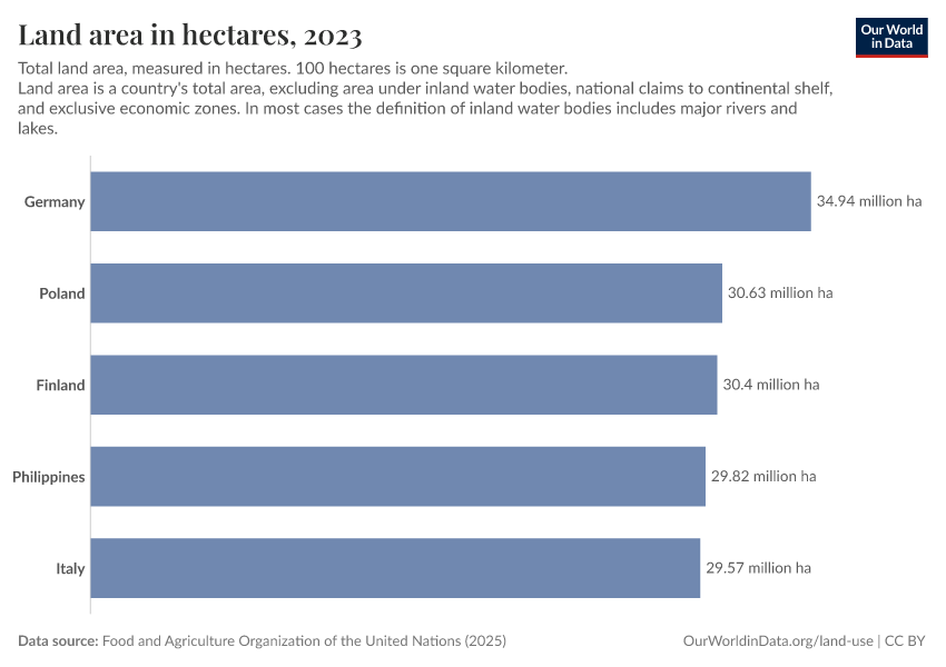 “Data Page: Land area in hectares”, part of the following publication: Hannah Ritchie, Pablo Rosado, and Max Roser (2023) - “Agricultural Production”. Data adapted from Food and Agriculture Organization of the United Nations. Retrieved from https://chart-preview-extension.owid.pages.dev:8789/20260119-235736/grapher/land-area-hectares.html [online resource] (archived on January 19, 2026).