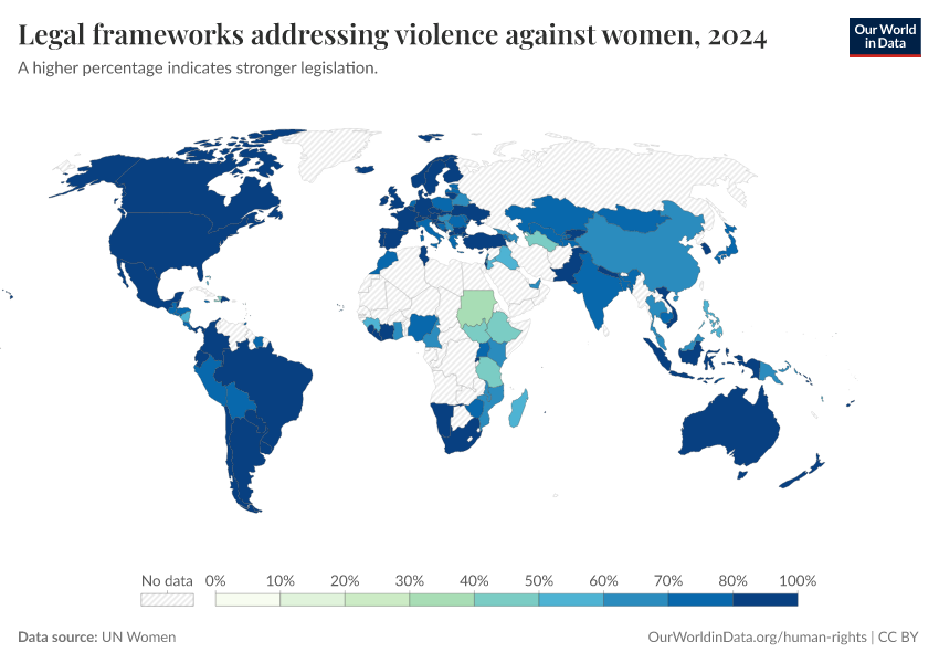 “Data Page: Legal frameworks addressing violence against women”. Our World in Data (2026). Data adapted from UN Women. Retrieved from https://chart-preview-extension.owid.pages.dev:8789/20260130-180113/grapher/legal-frameworks-regarding-violence-against-women.html [online resource] (archived on January 30, 2026).How to cite this data