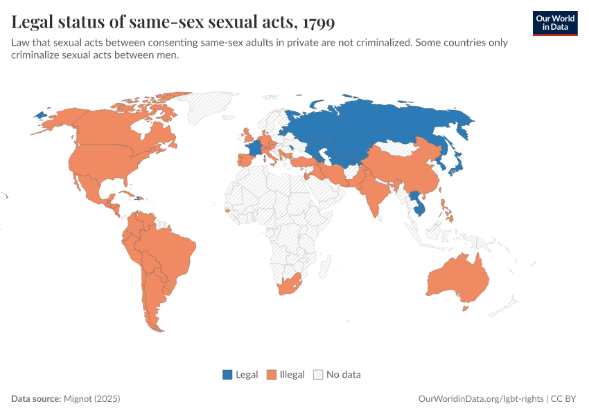 “Data Page: Legal status of same-sex sexual acts”, part of the following publication: Bastian Herre and Pablo Arriagada (2023) - “LGBT+ Rights”. Data adapted from Mignot. Retrieved from https://chart-preview-extension.owid.pages.dev:8789/20250909-093708/grapher/legal-status-of-same-sex-sexual-acts.html [online resource] (archived on September 9, 2025).How to cite this data