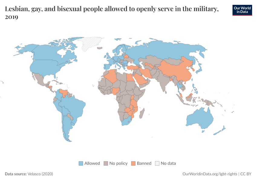 “Data Page: Lesbian, gay, and bisexual people allowed to openly serve in the military”, part of the following publication: Bastian Herre and Pablo Arriagada (2023) - “LGBT+ Rights”. Data adapted from Velasco. Retrieved from https://chart-preview-extension.owid.pages.dev:8789/20251023-195030/grapher/lgb-military-velasco.html [online resource] (archived on October 23, 2025).How to cite this data