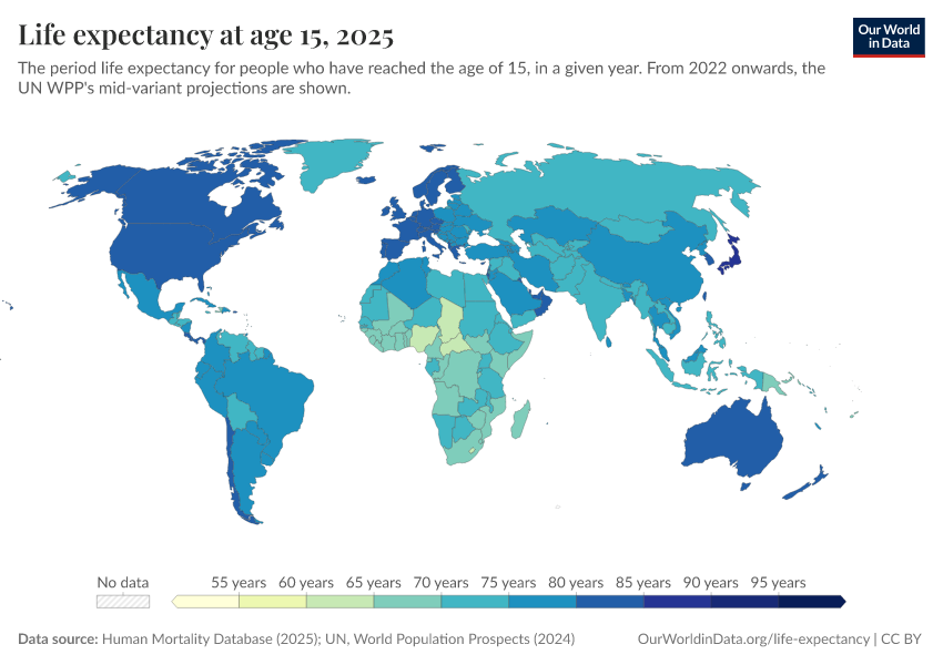 “Data Page: Life expectancy at 15”, part of the following publication: Saloni Dattani, Lucas Rodés-Guirao, Hannah Ritchie, Esteban Ortiz-Ospina, and Max Roser (2023) - “Life Expectancy”. Data adapted from Human Mortality Database, United Nations. Retrieved from https://chart-preview-extension.owid.pages.dev:8789/20251022-222946/grapher/life-expectancy-at-age-15.html [online resource] (archived on October 22, 2025).