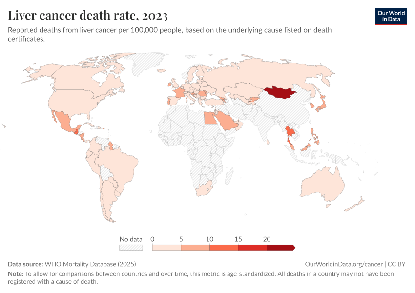 “Data Page: Liver cancer death rate”, part of the following publication: Saloni Dattani, Fiona Spooner, Hannah Ritchie, and Max Roser (2023) - “Causes of Death”. Data adapted from WHO Mortality Database. Retrieved from https://chart-preview-extension.owid.pages.dev:8789/20250909-093708/grapher/liver-cancer-death-rate.html [online resource] (archived on September 9, 2025).How to cite this data