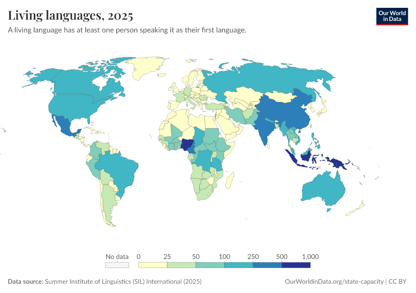 “Data Page: Living languages”, part of the following publication: Bastian Herre and Pablo Arriagada (2023) - “State Capacity”. Data adapted from Summer Institute of Linguistics (SIL) International. Retrieved from https://chart-preview-extension.owid.pages.dev:8789/20251023-195030/grapher/living-languages.html [online resource] (archived on October 23, 2025).How to cite this data