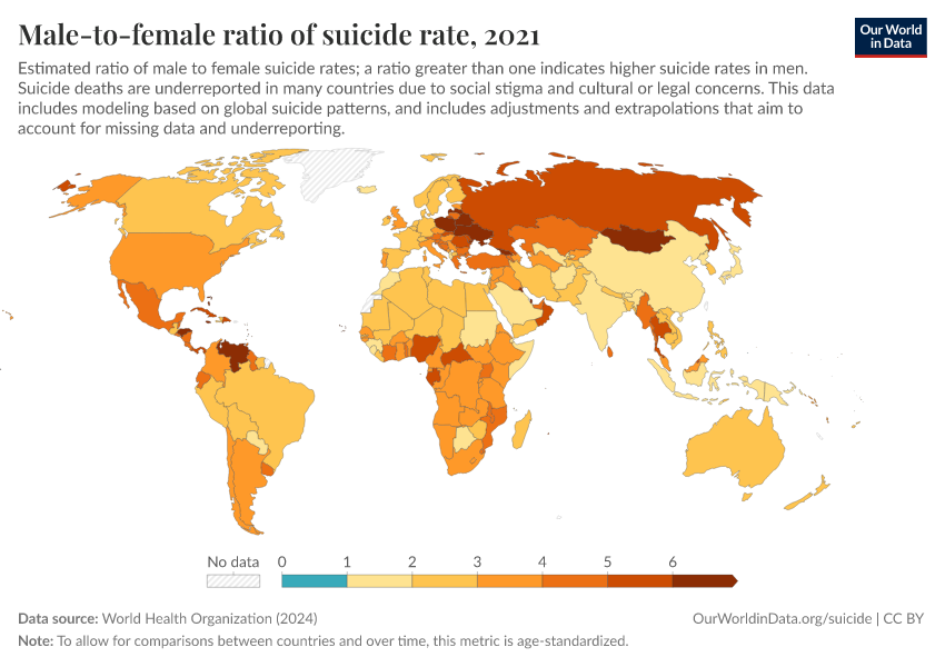 World Health Organization (2024) – with major processing by Our World in Data. “Male-to-female ratio of suicide rate” [dataset]. World Health Organization, “Global Health Estimates” [original data]. Retrieved February 12, 2026 from https://chart-preview-extension.owid.pages.dev:8789/20250909-093708/grapher/male-female-ratio-suicides-rates.html (archived on September 9, 2025).