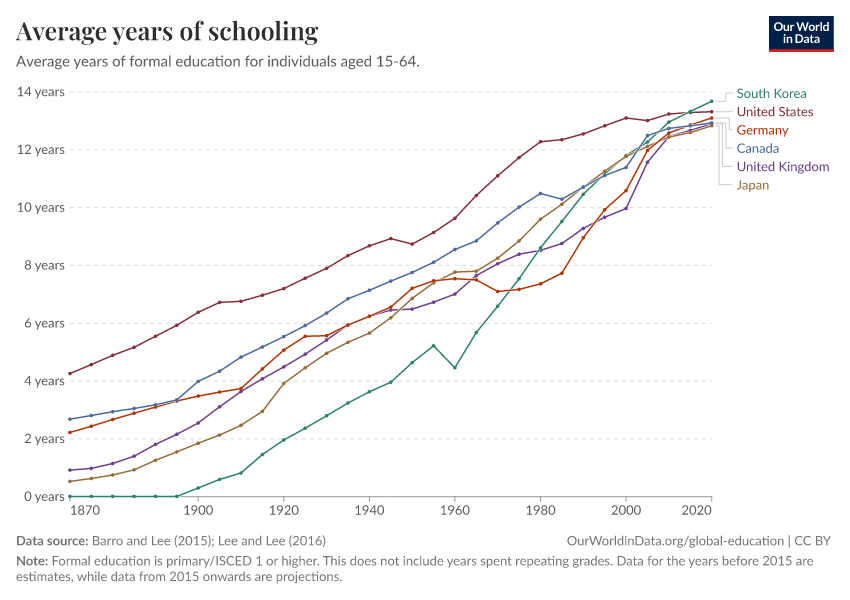 Barro and Lee (2015); Lee and Lee (2016) – with major processing by Our World in Data. “Average years of schooling” [dataset]. Barro and Lee, “Projections of Educational Attainment”; Lee and Lee, “Human Capital in the Long Run” [original data]. Retrieved February 12, 2026 from https://chart-preview-extension.owid.pages.dev:8789/20260119-070102/grapher/mean-years-of-schooling-long-run.html (archived on January 19, 2026).