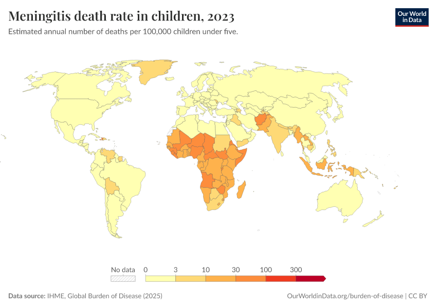 IHME, Global Burden of Disease (2025) – with major processing by Our World in Data. “Meningitis death rate in children” [dataset]. IHME, Global Burden of Disease, “Global Burden of Disease - Deaths” [original data]. Retrieved February 12, 2026 from https://chart-preview-extension.owid.pages.dev:8789/20260211-174736/grapher/meningitis-death-rates-children-under-5.html (archived on February 11, 2026).