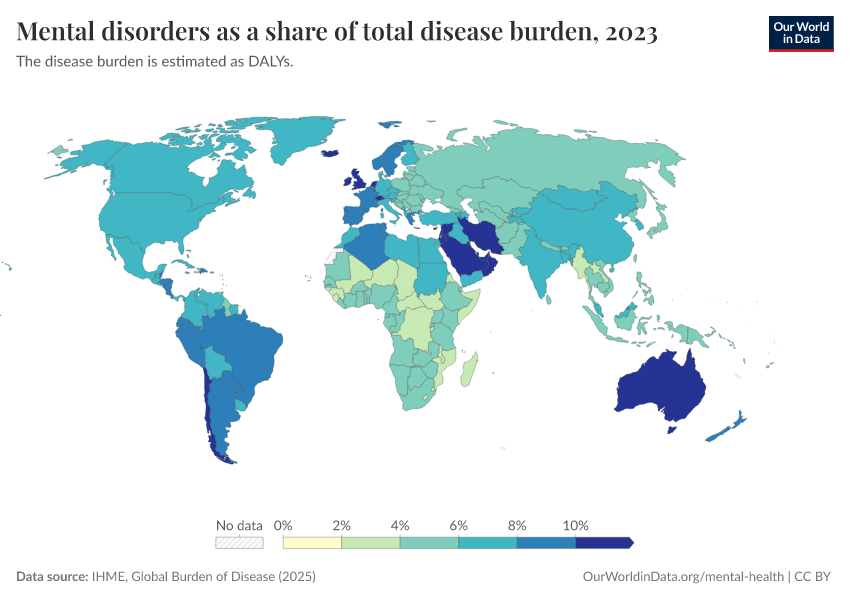 IHME, Global Burden of Disease (2025) – with major processing by Our World in Data. “Mental disorders as a share of total disease burden” [dataset]. IHME, Global Burden of Disease, “Global Burden of Disease - DALYs” [original data]. Retrieved February 12, 2026 from https://chart-preview-extension.owid.pages.dev:8789/20260211-174736/grapher/mental-and-substance-use-as-share-of-disease.html (archived on February 11, 2026).