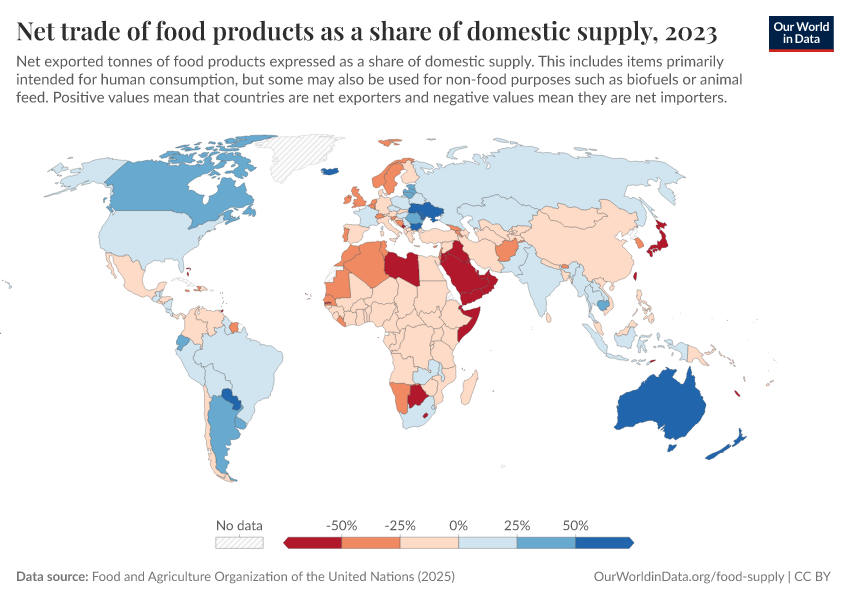 “Data Page: Net trade of food products as a share of domestic supply”, part of the following publication: Hannah Ritchie, Pablo Rosado, and Max Roser (2023) - “Agricultural Production”. Data adapted from Food and Agriculture Organization of the United Nations. Retrieved from https://chart-preview-extension.owid.pages.dev:8789/20260116-144923/grapher/net-food-trade-as-a-share-of-domestic-supply.html [online resource] (archived on January 16, 2026).How to cite this data