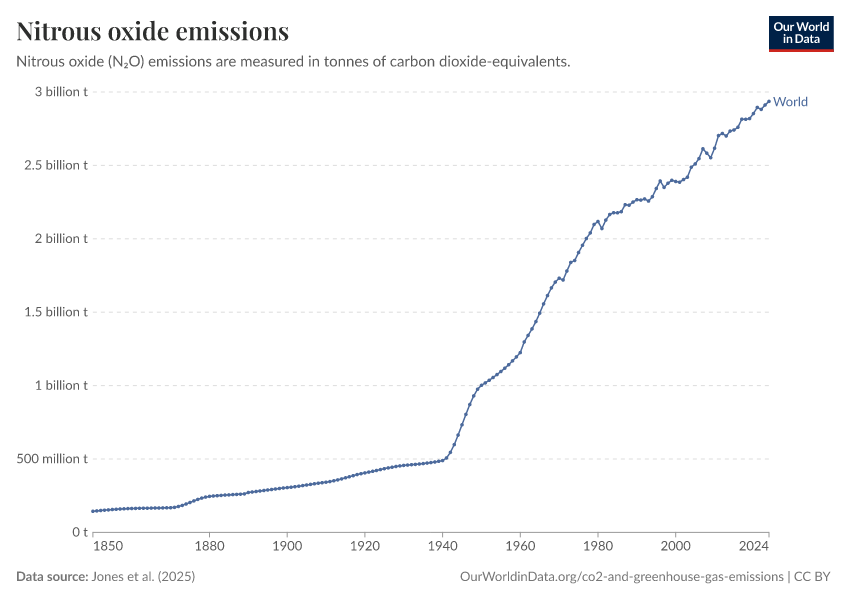 “Data Page: Annual nitrous oxide emissions including land use”, part of the following publication: Hannah Ritchie, Pablo Rosado, and Max Roser (2023) - “CO₂ and Greenhouse Gas Emissions”. Data adapted from Jones et al.. Retrieved from https://chart-preview-extension.owid.pages.dev:8789/20260119-070102/grapher/nitrous-oxide-emissions.html [online resource] (archived on January 19, 2026).How to cite this data