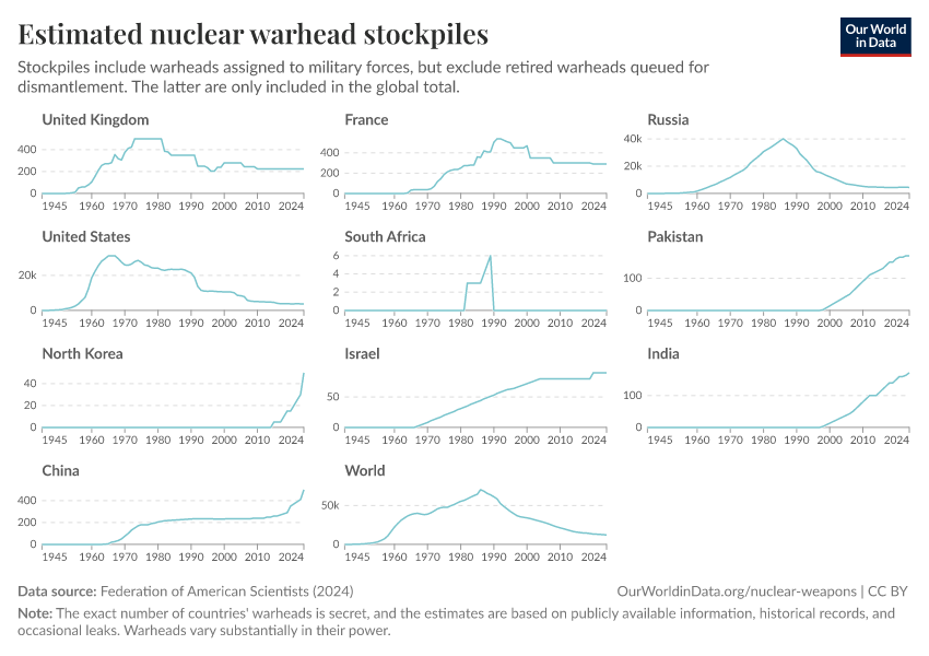 “Data Page: Estimated nuclear warhead stockpiles”, part of the following publication: Bastian Herre, Pablo Rosado, and Max Roser (2024) - “Nuclear Weapons”. Data adapted from Federation of American Scientists. Retrieved from https://chart-preview-extension.owid.pages.dev:8789/20250909-093708/grapher/nuclear-warhead-stockpiles-lines.html [online resource] (archived on September 9, 2025).How to cite this data