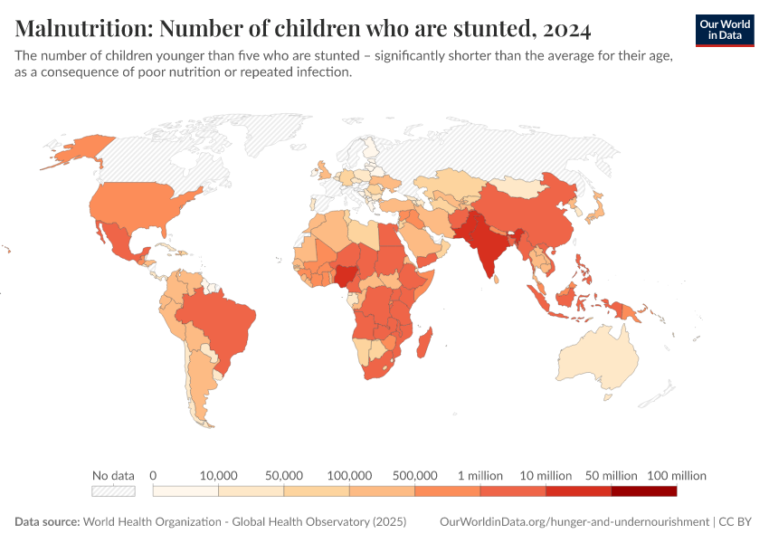 “Data Page: Malnutrition: Number of children who are stunted”. Our World in Data (2026). Data adapted from World Health Organization. Retrieved from https://chart-preview-extension.owid.pages.dev:8789/20260119-070102/grapher/number-children-stunted-who.html [online resource] (archived on January 19, 2026).How to cite this data