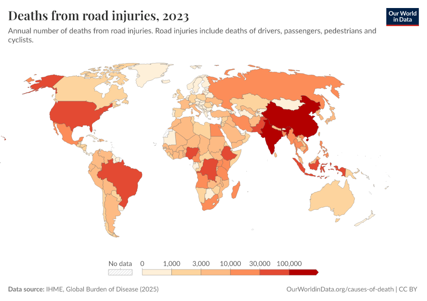 “Data Page: Deaths from road injuries”, part of the following publication: Esteban Ortiz-Ospina and Max Roser (2016) - “Global Health”. Data adapted from IHME, Global Burden of Disease. Retrieved from https://chart-preview-extension.owid.pages.dev:8789/20260211-173942/grapher/number-of-deaths-from-road-injuries.html [online resource] (archived on February 11, 2026).How to cite this data