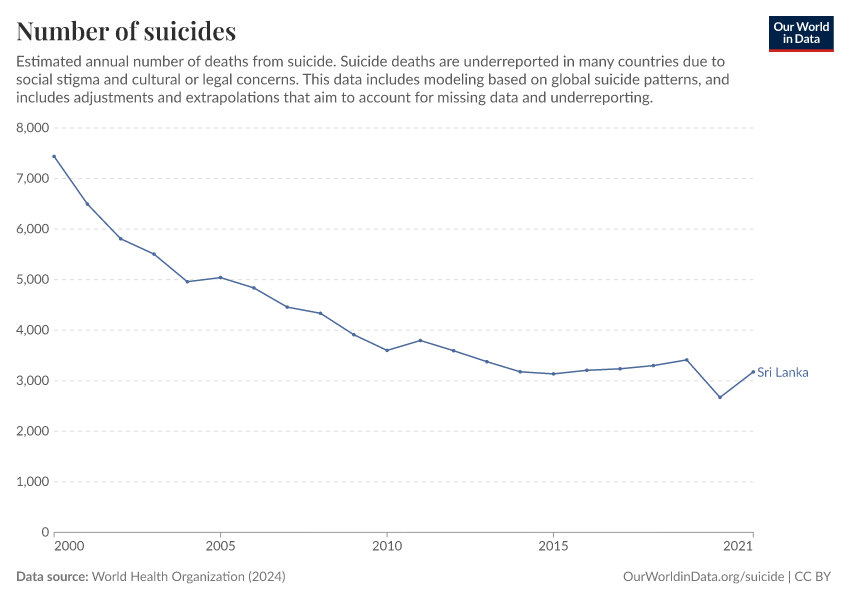 World Health Organization (2024) – with major processing by Our World in Data. “Number of suicides” [dataset]. World Health Organization, “Global Health Estimates” [original data]. Retrieved February 12, 2026 from https://chart-preview-extension.owid.pages.dev:8789/20250909-093708/grapher/number-of-deaths-from-suicide-ghe.html (archived on September 9, 2025).