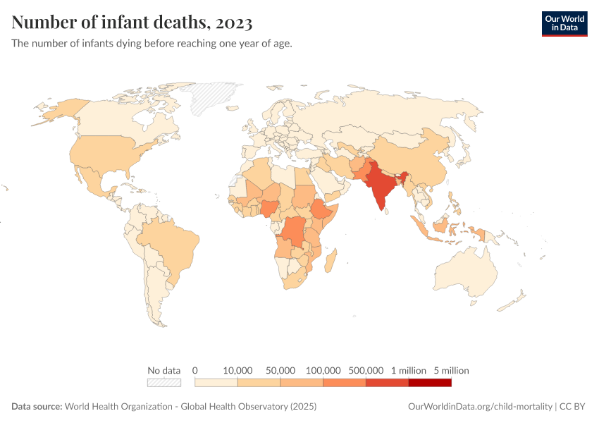 “Data Page: Number of infant deaths”. Our World in Data (2026). Data adapted from World Health Organization. Retrieved from https://chart-preview-extension.owid.pages.dev:8789/20260119-070102/grapher/number-of-infant-deaths-gho.html [online resource] (archived on January 19, 2026).How to cite this data