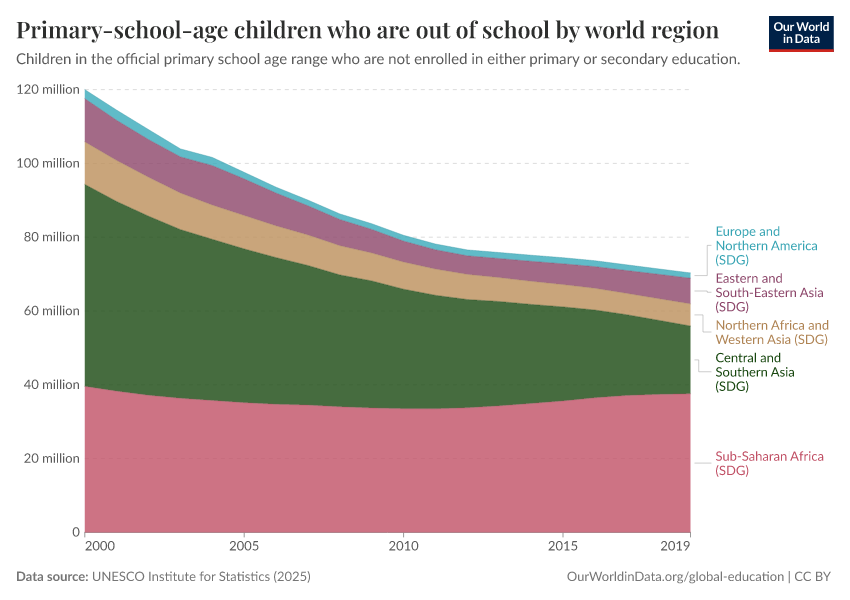 “Data Page: Out-of-school children of primary school age”, part of the following publication: Hannah Ritchie, Veronika Samborska, Esteban Ortiz-Ospina, and Max Roser (2023) - “Global Education”. Data adapted from UNESCO Institute for Statistics. Retrieved from https://chart-preview-extension.owid.pages.dev:8789/20260122-091445/grapher/out-of-school-children-of-primary-school-age-by-world-region.html [online resource] (archived on January 22, 2026).How to cite this data