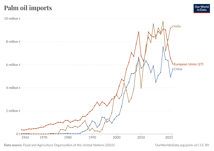 “Data Page: Imports of palm oil”. Our World in Data (2026). Data adapted from Food and Agriculture Organization of the United Nations. Retrieved from https://chart-preview-extension.owid.pages.dev:8789/20260116-144923/grapher/palm-oil-imports.html [online resource] (archived on January 16, 2026).