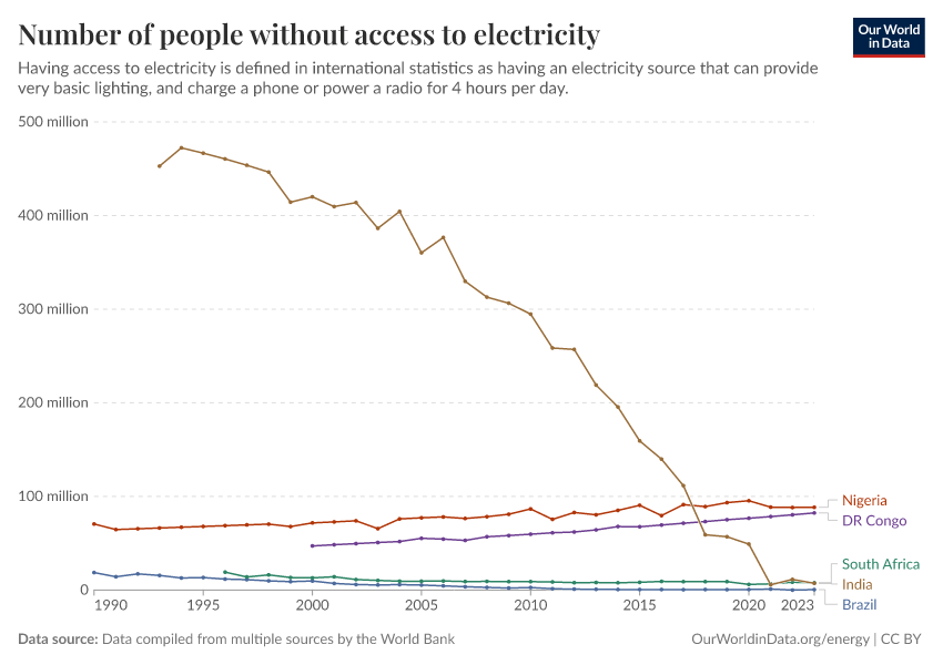 Data compiled from multiple sources by World Bank – with major processing by Our World in Data. “Number of people without access to electricity – World Bank” [dataset]. SDG 7.1.1 Electrification Dataset, World Bank, via World Bank, “World Development Indicators 125”; United Nations Population Division, national statistical offices, and Eurostat, via World Bank, “World Development Indicators 125” [original data]. Retrieved February 12, 2026 from https://chart-preview-extension.owid.pages.dev:8789/20260202-181317/grapher/people-without-electricity-country.html (archived on February 2, 2026).