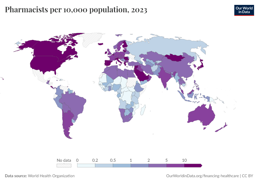 “Data Page: Pharmacists per 10,000 population”. Our World in Data (2026). Data adapted from World Health Organization. Retrieved from https://chart-preview-extension.owid.pages.dev:8789/20260130-180113/grapher/pharmaceutical-personnel-per-1000.html [online resource] (archived on January 30, 2026).How to cite this data