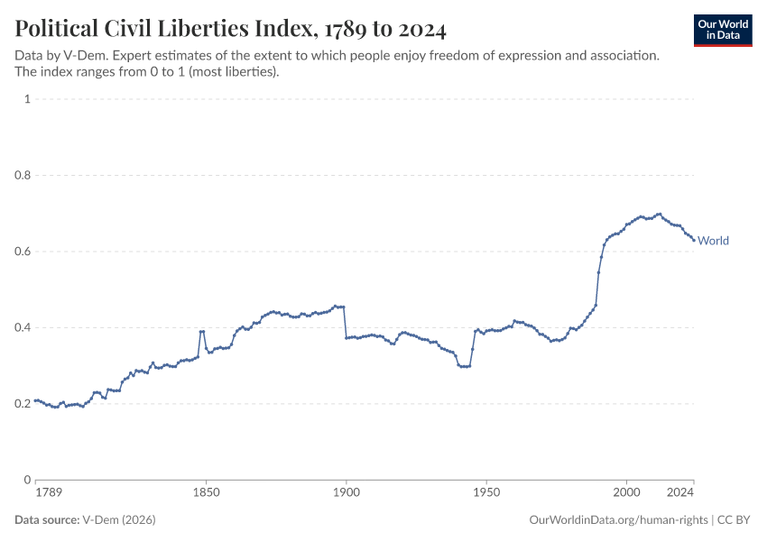 “Data Page: Political civil liberties index”, part of the following publication: Bastian Herre, Lucas Rodés-Guirao, and Esteban Ortiz-Ospina (2013) - “Democracy”. Data adapted from V-Dem. Retrieved from https://chart-preview-extension.owid.pages.dev:8789/20260119-070102/grapher/political-civil-liberties-index.html [online resource] (archived on January 19, 2026).