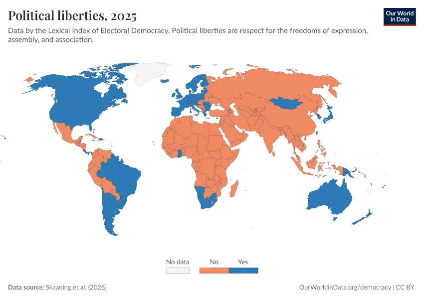 Skaaning et al. (2025) – processed by Our World in Data. “Political liberties” [dataset]. Skaaning et al., “Lexical Index of Electoral Democracy (LIED) v6.8” [original data]. Retrieved February 12, 2026 from https://chart-preview-extension.owid.pages.dev:8789/20260119-065148/grapher/political-liberties-lexical.html (archived on January 19, 2026).