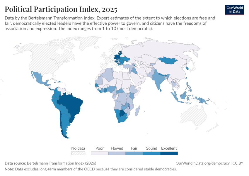 “Data Page: Political Participation Index”, part of the following publication: Bastian Herre, Lucas Rodés-Guirao, and Esteban Ortiz-Ospina (2013) - “Democracy”. Data adapted from Bertelsmann Transformation Index. Retrieved from https://chart-preview-extension.owid.pages.dev:8789/20260105-133053/grapher/political-participation-index-bti.html [online resource] (archived on January 5, 2026).How to cite this data