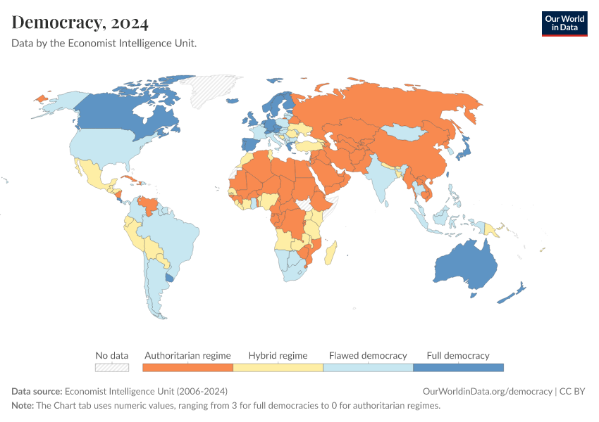 Economist Intelligence Unit (2006-2024) – processed by Our World in Data. “Democracy” [dataset]. Economist Intelligence Unit, “Democracy Index 2021: The China challenge”; Economist Intelligence Unit, “Democracy Index 2022: Frontline democracy and the battle for Ukraine”; Economist Intelligence Unit, “Democracy Index 2023: Age of Conflict”; Economist Intelligence Unit, “Democracy Index 2024: What's wrong with representative democracy?”; Gapminder, “Democracy Index v4” [original data]. Retrieved February 12, 2026 from https://chart-preview-extension.owid.pages.dev:8789/20260105-133053/grapher/political-regime-eiu.html (archived on January 5, 2026).