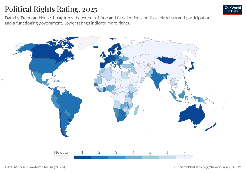Freedom House (2025) – processed by Our World in Data. “Political rights rating” [dataset]. Freedom House, “Freedom in the World” [original data]. Retrieved February 12, 2026 from https://chart-preview-extension.owid.pages.dev:8789/20260119-070102/grapher/political-rights-rating-fh.html (archived on January 19, 2026).
