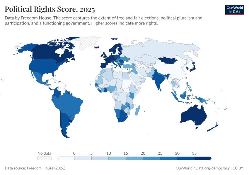 Freedom House (2025) – processed by Our World in Data. “Political Rights Score” [dataset]. Freedom House, “Freedom in the World” [original data]. Retrieved February 12, 2026 from https://chart-preview-extension.owid.pages.dev:8789/20260204-170225/grapher/political-rights-score-fh.html (archived on February 4, 2026).