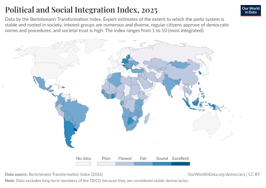 “Data Page: Political and Social Integration Index”, part of the following publication: Bastian Herre, Lucas Rodés-Guirao, and Esteban Ortiz-Ospina (2013) - “Democracy”. Data adapted from Bertelsmann Transformation Index. Retrieved from https://chart-preview-extension.owid.pages.dev:8789/20260105-133053/grapher/political-social-integration-index-bti.html [online resource] (archived on January 5, 2026).How to cite this data