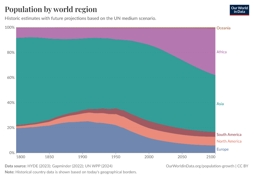 “Data Page: Population by world region”, part of the following publication: Hannah Ritchie, Lucas Rodés-Guirao, Edouard Mathieu, Marcel Gerber, Esteban Ortiz-Ospina, Joe Hasell, and Max Roser (2023) - “Population Growth”. Data adapted from PBL Netherlands Environmental Assessment Agency, Gapminder, United Nations. Retrieved from https://chart-preview-extension.owid.pages.dev:8789/20260119-065148/grapher/population-regions-with-projections.html [online resource] (archived on January 19, 2026).How to cite this data