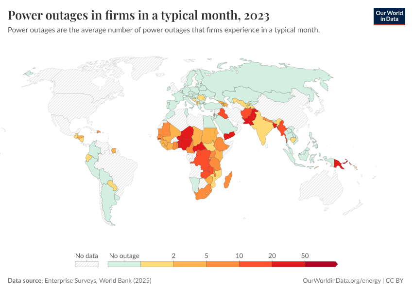 “Data Page: Power outages in firms in a typical month”. Our World in Data (2026). Data adapted from Enterprise Surveys, World Bank. Retrieved from https://chart-preview-extension.owid.pages.dev:8789/20260105-133053/grapher/power-outages-in-firms-per-month.html [online resource] (archived on January 5, 2026).