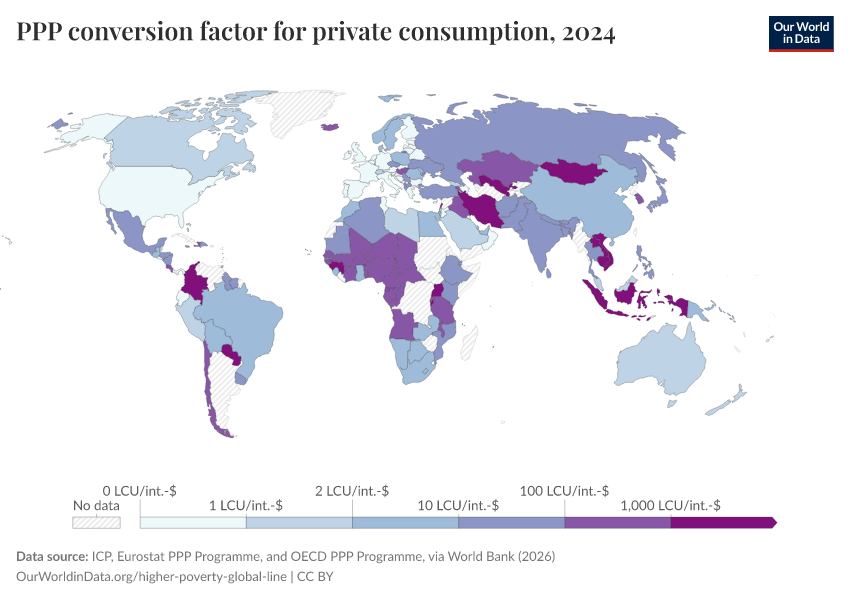 “Data Page: PPP conversion factor for private consumption”. Our World in Data (2026). Data adapted from ICP, Eurostat PPP Programme, and OECD PPP Programme, via World Bank. Retrieved from https://chart-preview-extension.owid.pages.dev:8789/20260202-181317/grapher/ppp-conversion-factor-for-private-consumption.html [online resource] (archived on February 2, 2026).How to cite this data