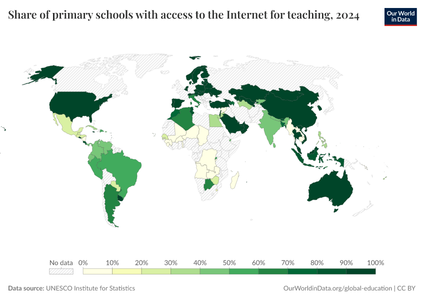 “Data Page: Share of primary schools with access to the Internet for teaching”. Our World in Data (2026). Data adapted from UNESCO Institute for Statistics. Retrieved from https://chart-preview-extension.owid.pages.dev:8789/20260130-180113/grapher/primary-schools-with-access-to-internet.html [online resource] (archived on January 30, 2026).How to cite this data
