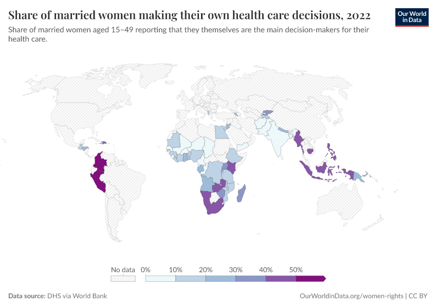 “Data Page: Share of married women making their own health care decisions”, part of the following publication: Bastian Herre, Veronika Samborska, Pablo Arriagada, and Hannah Ritchie (2023) - “Women’s Rights”. Data adapted from World Bank Gender Statistics. Retrieved from https://chart-preview-extension.owid.pages.dev:8789/20250916-204433/grapher/proportion-of-women-who-make-their-own-informed-health-care-decisions.html [online resource] (archived on September 16, 2025).How to cite this data