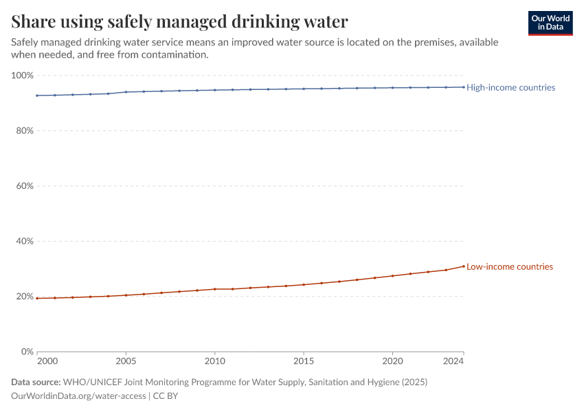 WHO/UNICEF Joint Monitoring Programme for Water Supply, Sanitation and Hygiene (2025) – processed by Our World in Data. “Share using safely managed drinking water” [dataset]. World Health Organization/UNICEF Joint Monitoring Programme for Water Supply, Sanitation and Hygiene, “WHO/UNICEF Joint Monitoring Programme for Water Supply, Sanitation and Hygiene (JMP) 2000-2024 report” [original data]. Retrieved February 12, 2026 from https://chart-preview-extension.owid.pages.dev:8789/20260116-114957/grapher/proportion-using-safely-managed-drinking-water.html (archived on January 16, 2026).
