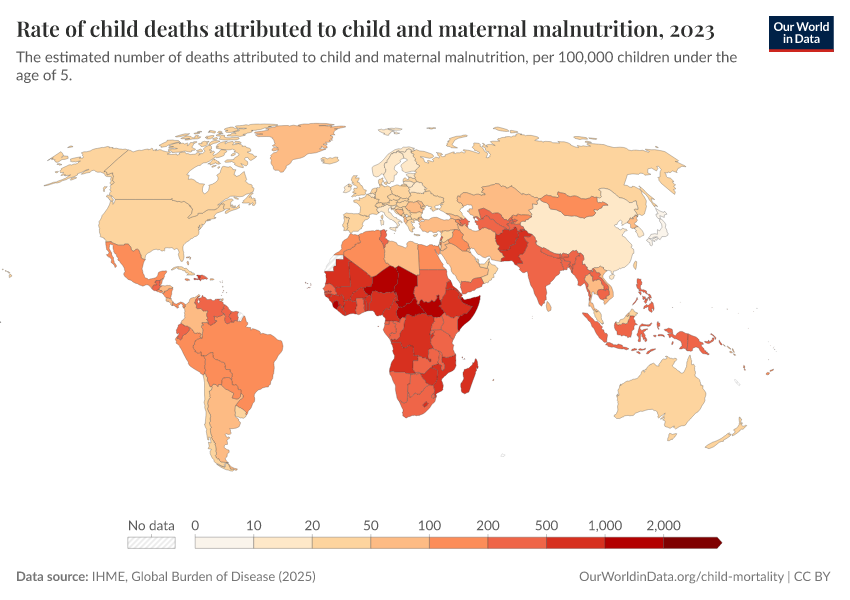 IHME, Global Burden of Disease (2024) – with minor processing by Our World in Data. “Rate of child deaths attributed to child and maternal malnutrition” [dataset]. IHME, Global Burden of Disease, “Global Burden of Disease - Risk Factors” [original data]. Retrieved February 12, 2026 from https://chart-preview-extension.owid.pages.dev:8789/20250909-093708/grapher/rate-of-child-deaths-attributed-to-child-and-maternal-malnutrition.html (archived on September 9, 2025).