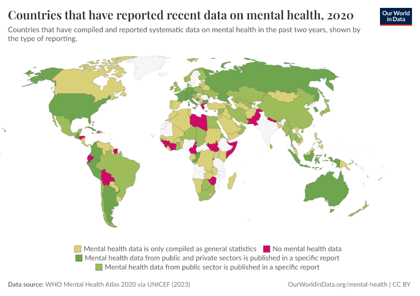 “Data Page: Countries that have reported recent data on mental health”, part of the following publication: Saloni Dattani, Lucas Rodés-Guirao, Hannah Ritchie, and Max Roser (2023) - “Mental Health”. Data adapted from WHO Mental Health Atlas 2020 via UNICEF. Retrieved from https://chart-preview-extension.owid.pages.dev:8789/20250909-093708/grapher/reporting-of-mental-health-system-data-in-the-past-two-years.html [online resource] (archived on September 9, 2025).How to cite this data