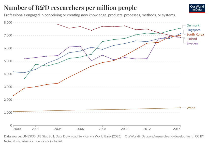 “Data Page: Number of R&D researchers per million people”. Our World in Data (2026). Data adapted from UNESCO UIS Stat Bulk Data Download Service, via World Bank. Retrieved from https://chart-preview-extension.owid.pages.dev:8789/20260202-181317/grapher/researchers-in-rd-per-million-people.html [online resource] (archived on February 2, 2026).How to cite this data
