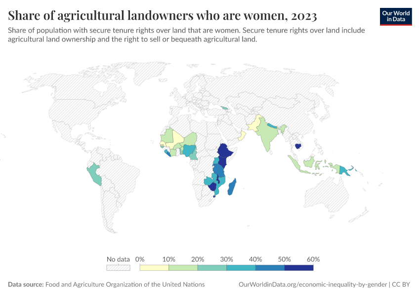 “Data Page: Share of agricultural landowners who are women”. Our World in Data (2026). Data adapted from Food and Agriculture Organization of the United Nations. Retrieved from https://chart-preview-extension.owid.pages.dev:8789/20260105-133053/grapher/share-of-agricultural-land-owners-that-are-women.html [online resource] (archived on January 5, 2026).How to cite this data
