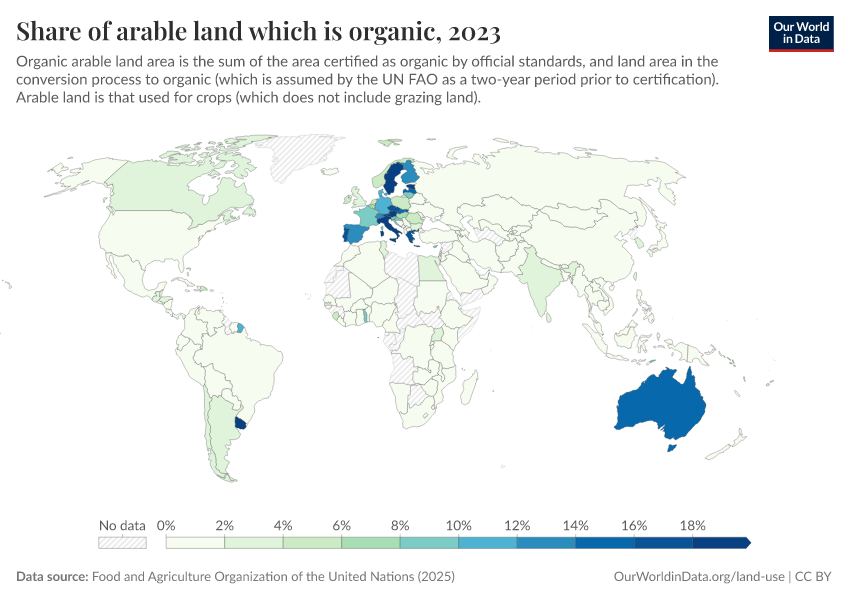 “Data Page: Share of arable land that is organic”, part of the following publication: Hannah Ritchie, Pablo Rosado, and Max Roser (2023) - “Agricultural Production”. Data adapted from Food and Agriculture Organization of the United Nations. Retrieved from https://chart-preview-extension.owid.pages.dev:8789/20260116-143329/grapher/share-of-arable-land-which-is-organic.html [online resource] (archived on January 16, 2026).How to cite this data