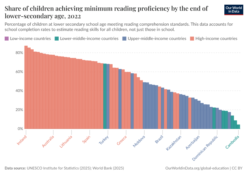 “Data Page: Share of children achieving minimum reading proficiency by the end of lower secondary age”, part of the following publication: Hannah Ritchie, Veronika Samborska, Esteban Ortiz-Ospina, and Max Roser (2023) - “Global Education”. Data adapted from UNESCO Institute for Statistics. Retrieved from https://chart-preview-extension.owid.pages.dev:8789/20260122-091445/grapher/share-of-children-reaching-sufficient-reading-comprehension-by-the-end-of-lower-secondary-age.html [online resource] (archived on January 22, 2026).How to cite this data
