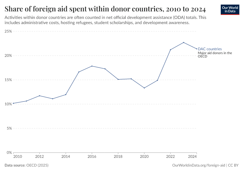 OECD (2025) – with minor processing by Our World in Data. “Share of foreign aid spent within donor countries – Net disbursements” [dataset]. OECD, “OECD Official Development Assistance (ODA) - DAC1: Flows by provider (ODA+OOF+Private)” [original data]. Retrieved February 12, 2026 from https://chart-preview-extension.owid.pages.dev:8789/20251230-141326/grapher/share-of-foreign-aid-spent-within-donor-countries.html (archived on December 30, 2025).