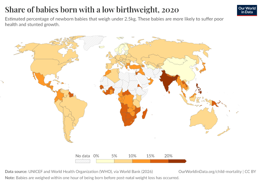 “Data Page: Share of babies born with a low birthweight”. Our World in Data (2026). Data adapted from UNICEF and World Health Organization (WHO), via World Bank. Retrieved from https://chart-preview-extension.owid.pages.dev:8789/20260202-181317/grapher/share-of-low-birthweight-babies-born.html [online resource] (archived on February 2, 2026).How to cite this data