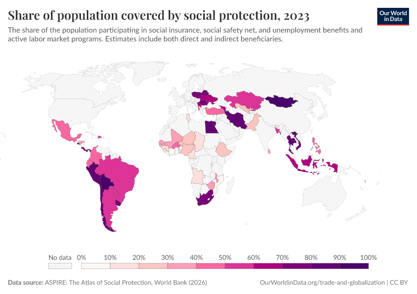 “Data Page: Share of population covered by social protection”. Our World in Data (2026). Data adapted from ASPIRE: The Atlas of Social Protection, World Bank. Retrieved from https://chart-preview-extension.owid.pages.dev:8789/20260202-181317/grapher/share-of-population-covered-by-social-protection.html [online resource] (archived on February 2, 2026).How to cite this data