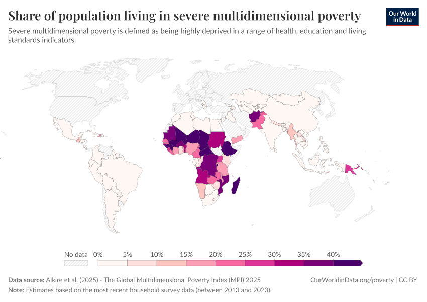“Data Page: Share of population living in severe multidimensional poverty”, part of the following publication: Joe Hasell, Bertha Rohenkohl, Pablo Arriagada, Esteban Ortiz-Ospina, and Max Roser (2022) - “Poverty”. Data adapted from Alkire et al.. Retrieved from https://chart-preview-extension.owid.pages.dev:8789/20251229-175603/grapher/share-of-population-in-severe-multidimensional-poverty.html [online resource] (archived on December 29, 2025).How to cite this data