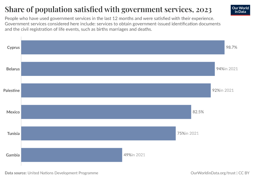 “Data Page: Share of population satisfied with government services”. Our World in Data (2026). Data adapted from United Nations Development Programme. Retrieved from https://chart-preview-extension.owid.pages.dev:8789/20251120-211749/grapher/share-of-population-satisfied-with-government-services.html [online resource] (archived on November 20, 2025).How to cite this data