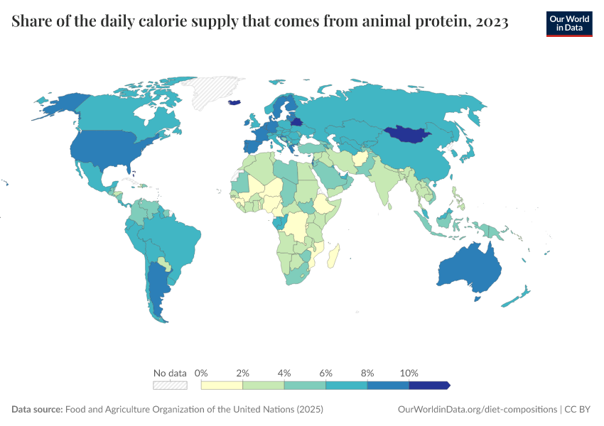 “Data Page: Share of the daily calorie supply that comes from animal protein”, part of the following publication: Hannah Ritchie, Pablo Rosado, and Max Roser (2023) - “Agricultural Production”. Data adapted from Food and Agriculture Organization of the United Nations. Retrieved from https://chart-preview-extension.owid.pages.dev:8789/20260116-144923/grapher/share-of-the-daily-calorie-supply-that-comes-from-animal-protein.html [online resource] (archived on January 16, 2026).How to cite this data